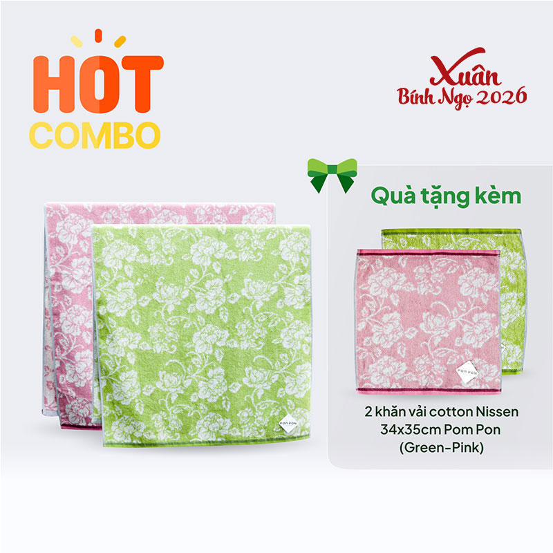 Combo siêu hời mua 2 Khăn vải cotton Nissen 60x120cm Pom Pon tặng 2 Khăn vải cotton Nissen 34x35cm Pom Pon(Green-Pink) - Hachi Hachi Japan Shop