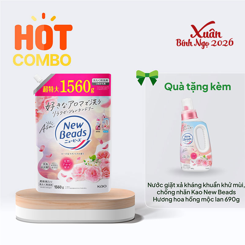 Nước giặt xả kháng khuẩn khử mùi, chống nhăn Kao New Beads Hương hoa hồng mộc lan 1560g