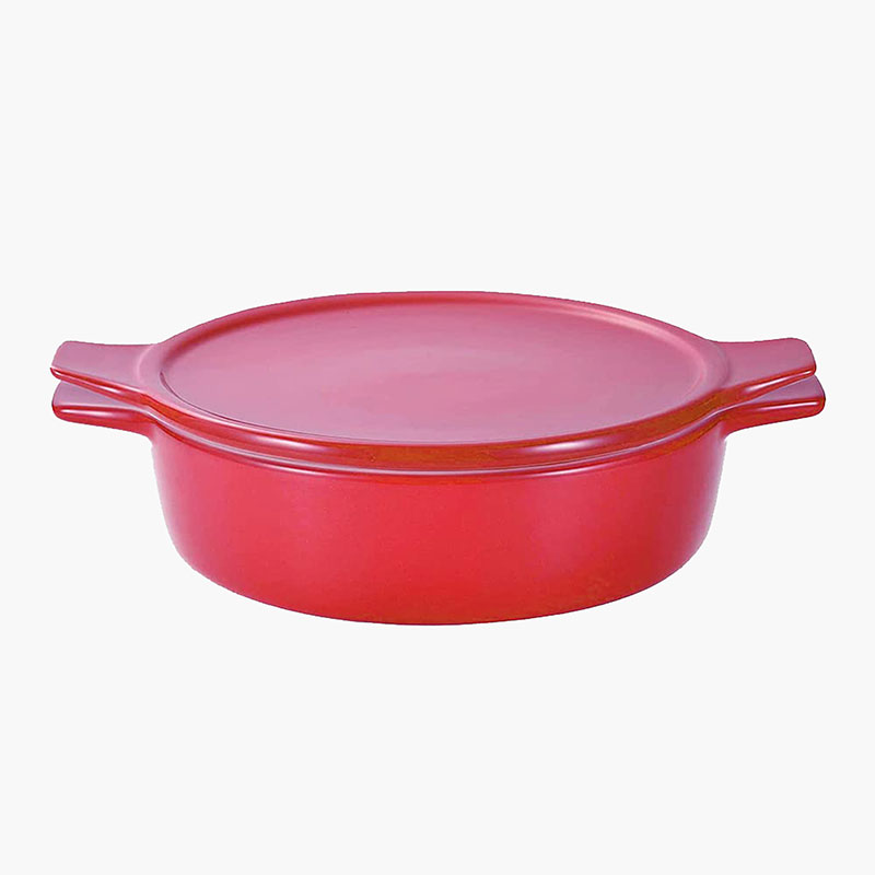 Khuôn gốm sứ chịu nhiệt giúp truyền nhiệt đều và giữ ấm lâu, cho món ăn chín đều, thơm ngon. Nắp đậy tiện lợi có thể tận dụng làm đĩa để thức ăn hâm trong lò vi sóng, hoặc đặt trực tiếp trên bàn ăn. Màu đỏ rực rỡ còn góp phần làm nổi bật không gian bếp và tạo cảm hứng khi nấu nướng.