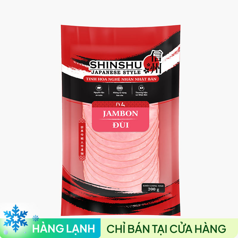 Jampon đùi đến từ thương hiệu Shinshu cao cấp, với công thức bí truyền lâu đời từ 1947, được ưa chuộng ở xứ Phù Tang. Nguyên liệu chủ yếu là thịt đùi heo được lựa chọn và chế biến theo tiêu chuẩn Nhật Bản. Được thái mỏng, màu thịt đẹp bắt mắt. Săn chắc, mềm ngon từng miếng. Thích hợp dùng chung với bánh mỳ, áp chảo, nhâm nhi cùng bia rượu. Đặc biệt, sản phẩm không chứa hàn the, an toàn cho sức khỏe người tiêu dùng.