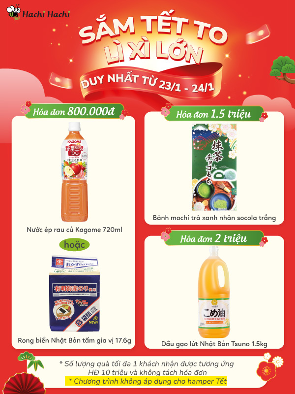 Từ ngày 23/1 - 24/1/2025 với hóa đơn từ 800.000đ Hachi Hachi xin dành tặng Quý khách những phần quà hấp dẫn. Kính chúc Quý khách một năm mới bình an, sức khỏe, thành công rực rỡ.